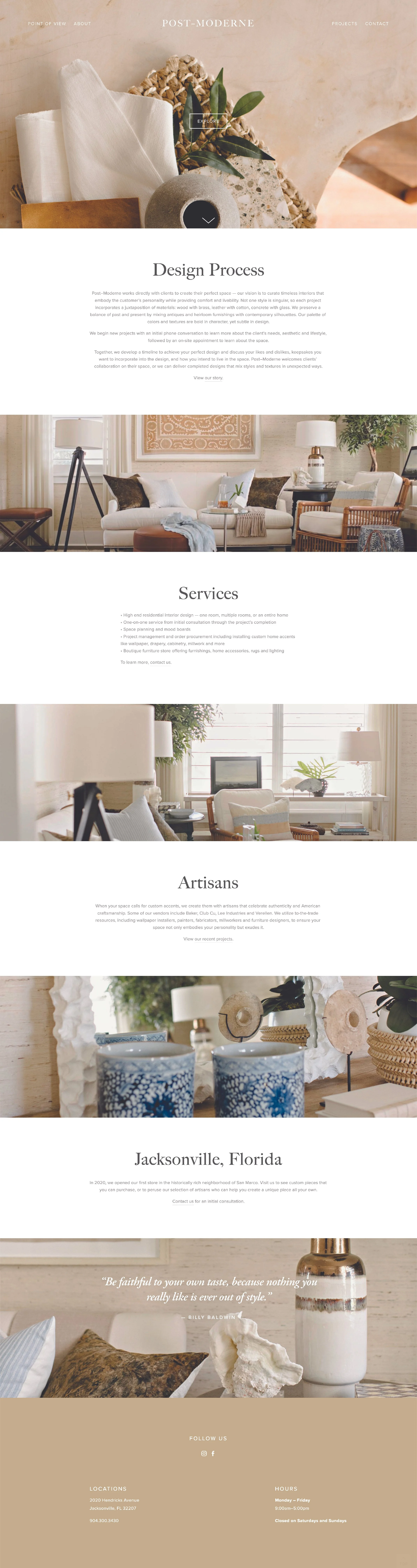 Post–Moderne is a high-end interior decorating business based in Jacksonville, Florida that specializes in creating timeless interiors that rely on simplicity and always incorporate natural fibers and locally sourced pieces. They provide a holistic design experience through space planning, design implementation, and installation. Post-Moderne opened the doors to their first brick-and-mortar in Spring 2020 to provide curated furniture, rugs, and art for clients to individually purchase on-site.